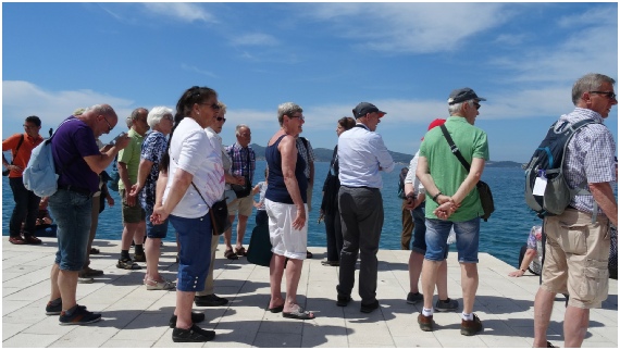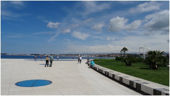 Het kunstwerk De Zonnegroet in Zadar is een grote cirkel die overdag oplaadt door middel van driehonderd zonnecellen en 's avonds gekleurd licht geeft. Het is dus een duurzaam kunstwerk. Het is nooit hetzelfde door de talloze variaties in de lichtpatronen en kleuren. Iedereen die Zadar bezoekt moet dit gewoon gezien hebben want het is een fantastische kunstwerk op het mooiste punt van de oude stad Zadar.