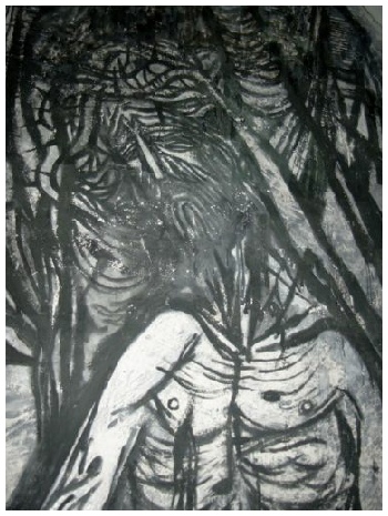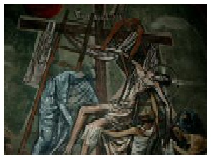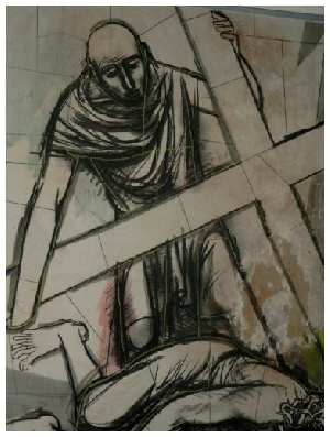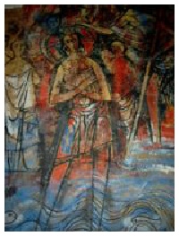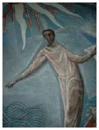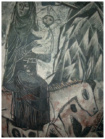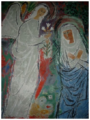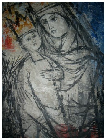 De wanden links en rechts van de hoofdingang zijn heel erg problematisch. Het bestaande stukwerk rondom de 2 schitterende tableaus van de annuntiata en moeder Maria met kind is helemaal verkankerd en moet als verloren worden beschouwd. De restauratie van de annuntiata zal niet al te problematisch zijn omdat het schilderwerk nog in goede staat is en de ondergrond nog samenhang vertoont. De restauratie van moeder en kind is veel problematischer. Veel pigmenten hebben losgelaten van de ondergrond en de figuratie verdwijnt hoe langer hoe meer tengevolge van de wisselende vochthuishouding in de ondergrond, waarschijnlijk te wijten aan de aanwezigheid van de buitentrap aan de buitenzijde van de muur waar voortdurend indringing van water plaatsvindt.