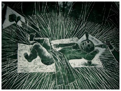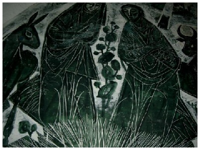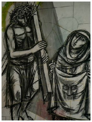 Tijdens het pinksterweekend van 3 juni zijn Michel en ik weer eens met zijn tweeën en vinden we de rust om alle achtergebleven karweitjes op te knappen zoals het bijmaken van het voegwerk op maaiveldniveau, het maken van de putdeksels op de hemelafvoerputten, het verwijderen van algen op de muren, het aanbrengen van de ontbrekende vloertegels het aanbrengen van de glasbrokken rond de schilderingen en het repareren van de binnenmuren in de toren. Wij worden ook uitgenodigd op het eten door Rob en Inge Behling, en daar horen we vele verhalen over de geschiedenis van Jeantes. Het verre verleden en de verhalen over pastoor Suasso, de inwoners van Jeantes en verder alles wat ter tafel komt. Ik ben er van overtuigd dat zij een dik boek zouden kunnen schrijven over de bewogen geschiedenis van dit dorp. Inge is als kunstenares verknocht aan de bodem waarop ze werkt, de kleuren van de omgeving en de aantrekkingskracht van de ondergrond die zij sterk aanvoelt. Volgens haar zijn er niet voor niets zoveel mensen en met name kunstenaars die zich aangetrokken voelen tot dit stukje Frankrijk. Zij is zelfs van mening dat ik en de vele vrijwilligers daarom naar hier komen. Ik weet het niet en ik zou zelf zeker niet zover durven gaan, maar gezellig was het wel, die avond. Wij hebben die avond ook besproken dat de fries van het nieuwe altaar door haar kan worden uitgevoerd, mits het verdere ontwerp past binnen de mogelijkheden.