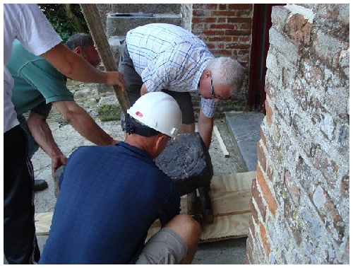 Wij rollen de steen naar binnen tot de beoogde plaats in de kerk.