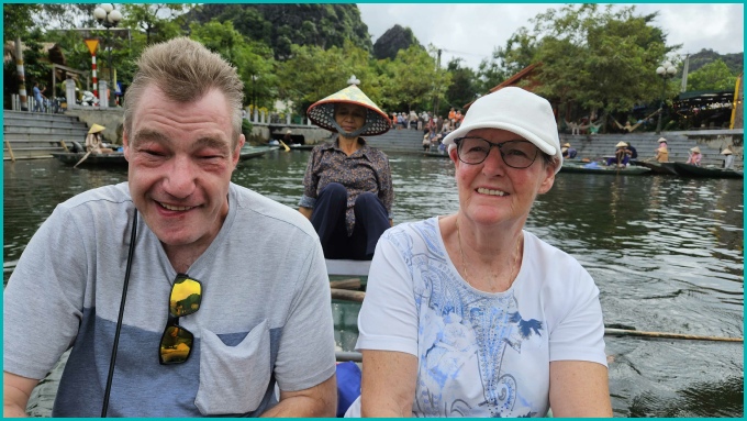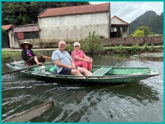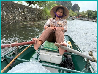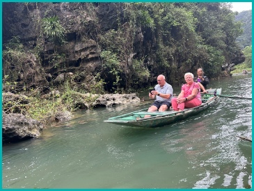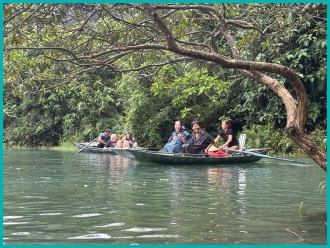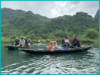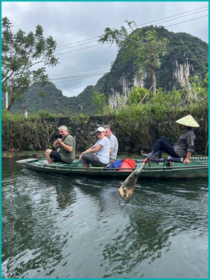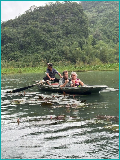Na een bezoek aan de pagodes en tempels zijn wij in kleine bootjes gestapt om ons te laten roeien door de prachtige omgeving van Tam Coc; het was opvallend dat de roeiers dit met hun voeten deden.