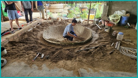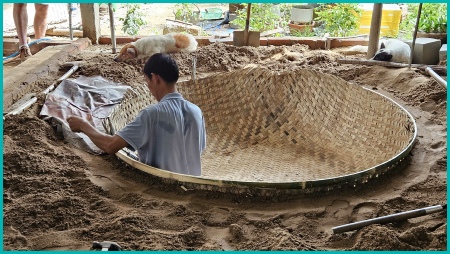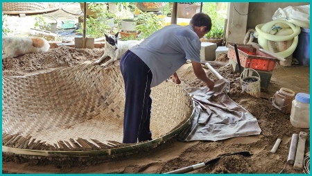 Traditioneel worden de gaten in het vlechtwerk opgevuld met een mengsel van buffelmest, kalkpoeder en boomhars, dat vervolgens in de zon wordt gedroogd.