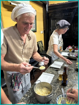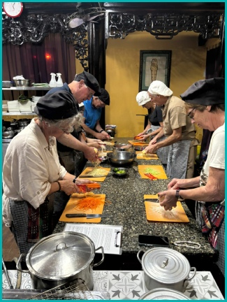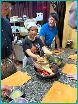 Henny, Gijs, Bianca, Patrick, Joke, Roland, Elly en Rayner zijn 's avonds op kookles gegaan.