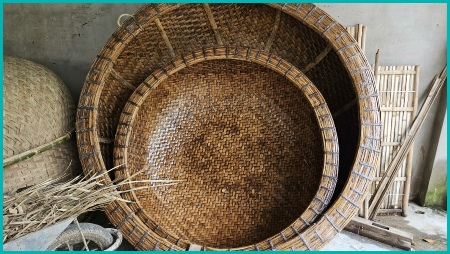 De ambachtslieden creëren een basisframe door bamboestokken te weven tot een grote, platte mat. Dit vereist veel vaardigheid en precisie.